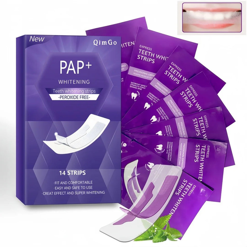 As tiras libertam agentes branqueadores que penetram no esmalte, removendo manchas superficiais e devolvendo o brilho natural dos dentes.