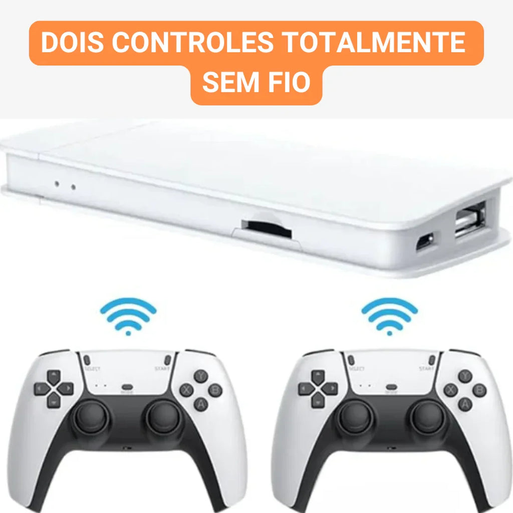 Você conecta no HDMI de sua televisão e na saída USB. E pronto!! Ele vem completo com 2 controles sem fio estilo PS5.